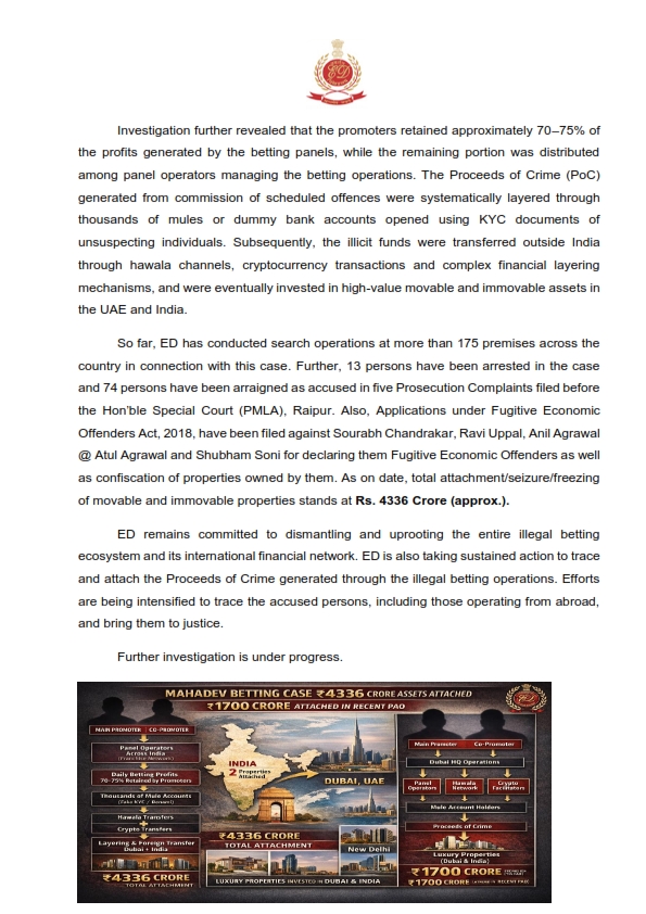 - 1700 करोड़ की जब्ती: ED ने मुख्य आरोपी सौरभ चंद्राकर और उसके सहयोगियों की देश-विदेश की करीब 1700 करोड़ रुपये की संपत्तियां कुर्क की हैं।